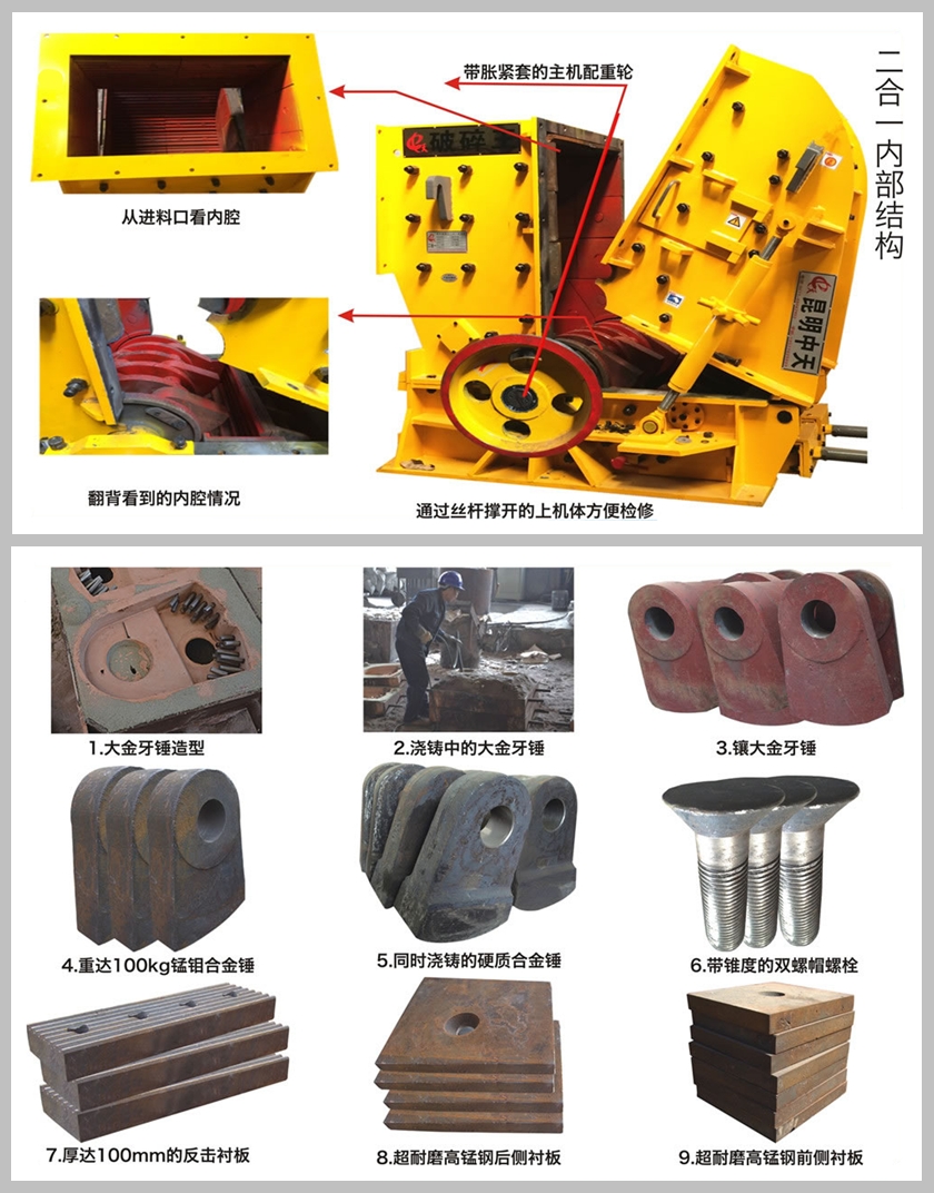 可破碎花崗巖、玄武巖、鵝卵石、鐵礦石等高硬度、磨損大的物料。破碎硬質(zhì)石料選用鑲大金牙錘或者同時澆鑄的硬質(zhì)合金錘,也可選用反擊式板錘。