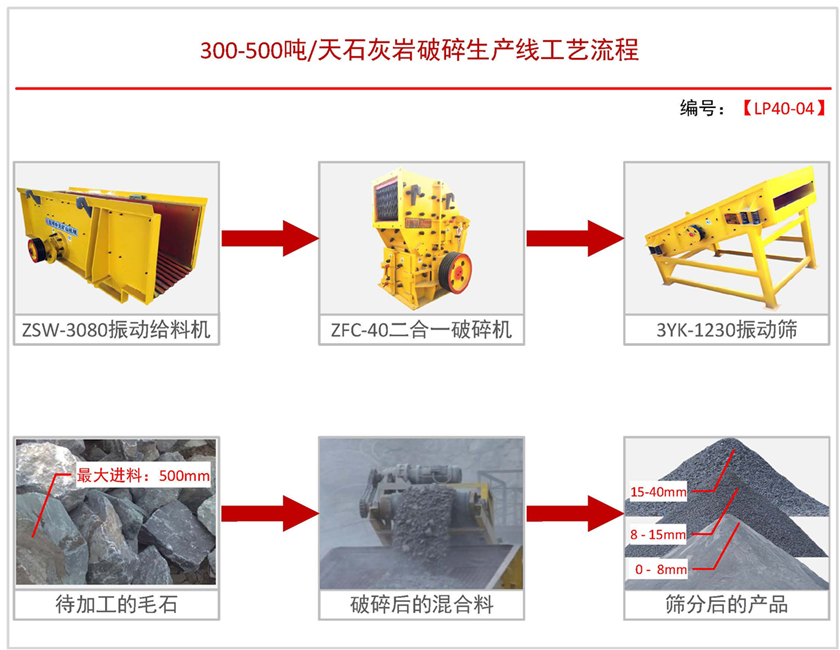 導讀:日產300-500噸配置方案四【最大進料】:≤500mm 【生產能力】:30-50t/h【裝機功率】:112KW 【適用物料】:石灰石【出料規格】:(1)0-8mm (2)8-15mm (3)15-40mm【方案優勢】:1.投資小2.省電3.能破大料4.配件損耗低 我廠專業生產制砂設備生產線20余年,公司目前有3個廠在昆明…
